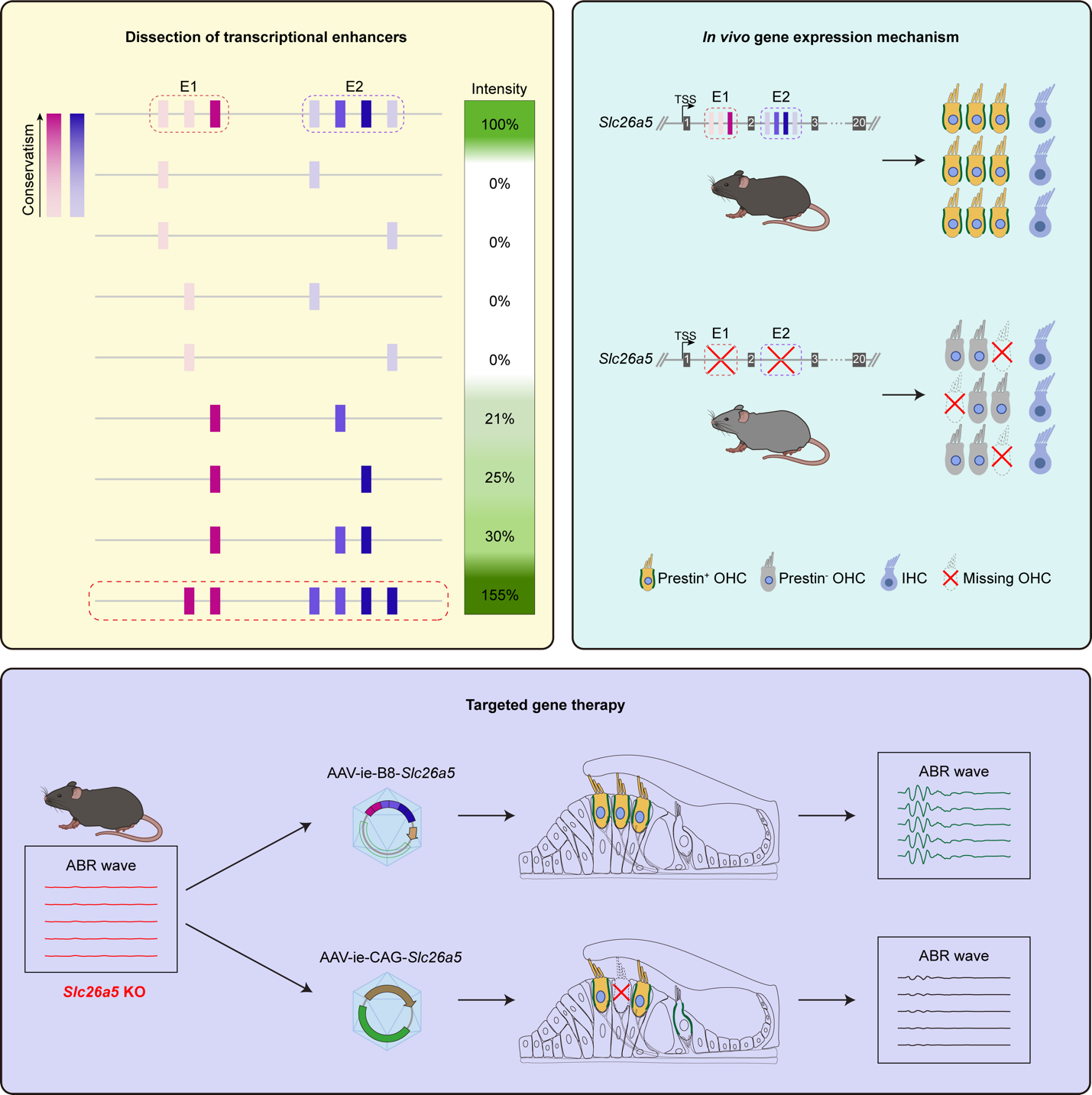 利用ARBITER系统解析并重组了Slc26a5的调控增强子,结合体内敲除小鼠模型验证了增强子对基因调控的重要作用,并最终将重构的细胞特异性增强子用于基因的精准递送,成功恢复了遗传性耳聋小鼠的听力