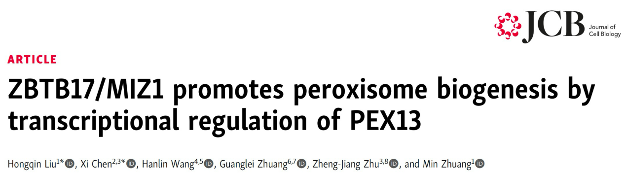 该论文中,研究人员构建了能指征过氧化物酶体功能的双荧光报告细胞系,通过CRISPR/Cas9和泛素连接酶sgRNA文库来筛选人类过氧化物酶体的调控因子,发现ZBTB17(MIZ1)在调节蛋白质向过氧化物酶体转运中发挥重要作用。独立于其泛素连接酶活性,ZBTB17/MIZ1作为转录因子调控关键转运蛋白PEX13的表达,从而影响过氧化物酶体中代谢酶的定位和过氧化物酶体的成熟。 此外,代谢组学分析表明,敲低ZBTB17或PEX13均导致嘌呤合成下调等相似代谢变化。该研究发现并阐明了ZBTB17通过调节过氧化物酶体蛋白质转运来改变过氧化物酶体功能和核苷酸代谢的机制,为代谢性疾病和过氧化物酶体相关疾病治疗提供了新的思路。