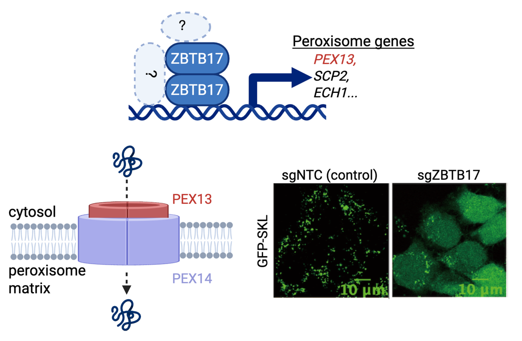 图注:ZBTB17作为转录因子调控一系列和过氧化物酶体相关的基因表达,含过氧化物酶体基质中的多种代谢酶(如SCP2, ECH1等)和过氧化物酶体代谢酶的关键转运蛋白PEX13. PEX13是形成过氧化物酶体转运通道的重要结构蛋白。GFP-SKL指征代谢酶的定位,ZBTB17的缺失使得PEX13表达下降,从而影响代谢酶的分布。