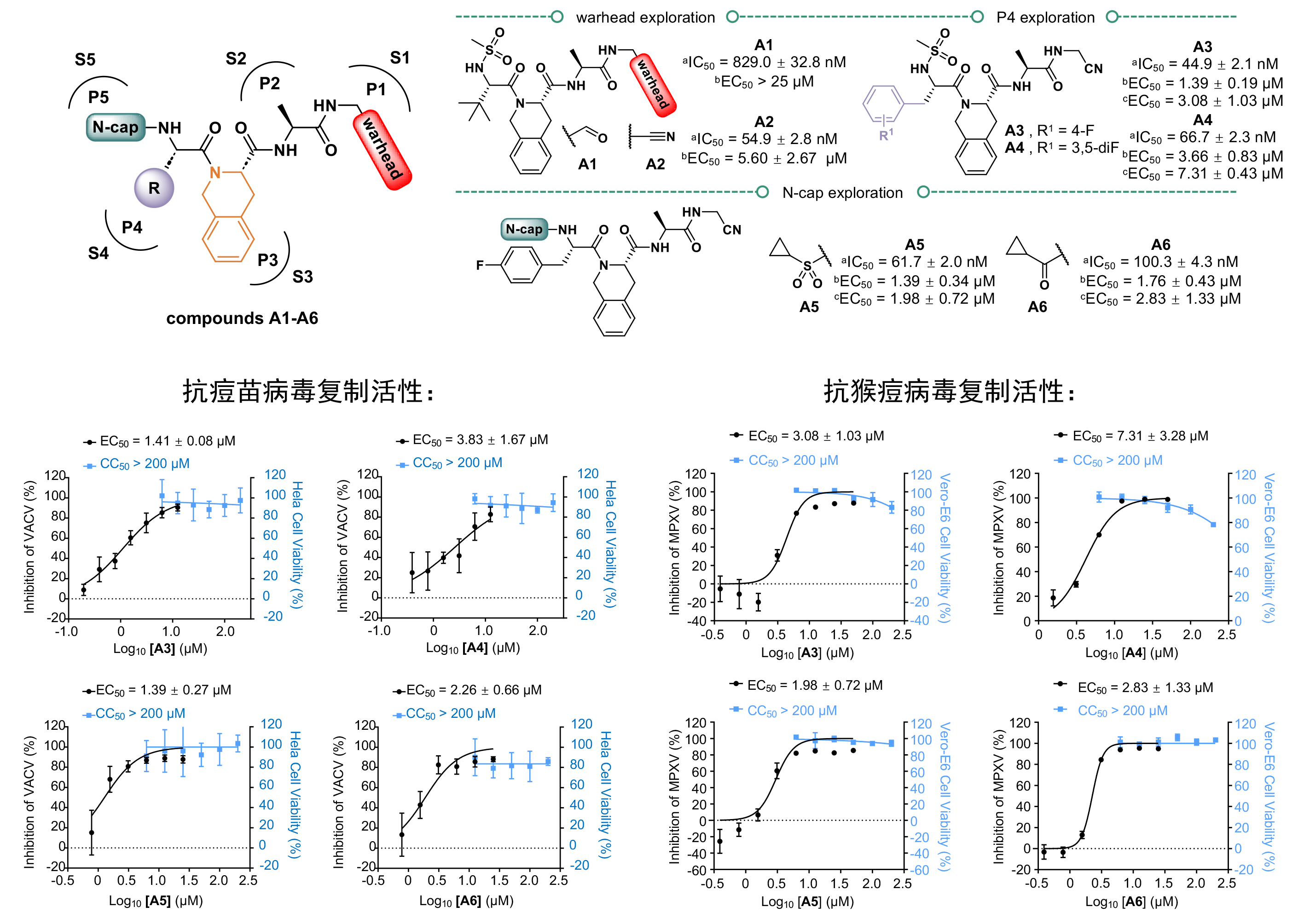a抗猴痘病毒核心蛋白酶活性;b抗痘苗病毒复制活性;c抗猴痘病毒复制活性)