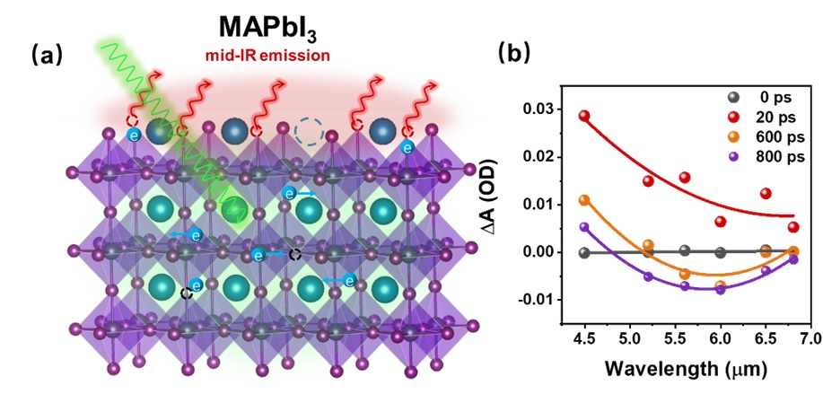 1 (a) MAPbI3表面中红外发射缺陷态示意图; (b)不同时间延迟下的瞬态中红外光谱