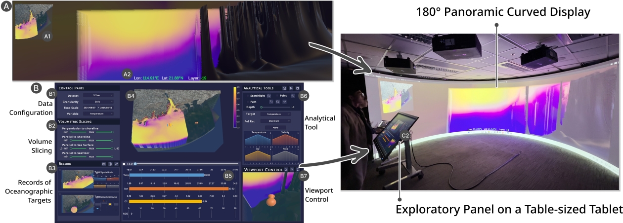 针对此,李权课题组提出了一个支持沉浸式空间叙事的海洋可视化系统OceanVive。它系统整合了大型弧形显示器与桌面平板设备,允许用户通过平板进行内容操控,在大屏上同步沉浸式探索三维网格海洋数据,从而获得连贯、生动的空间叙述体验。OceanVive支持多角度数据切片、自适应视觉编码等功能,帮助用户直观理解温度、盐度、溶解氧等关键变量的时空演化过程。
