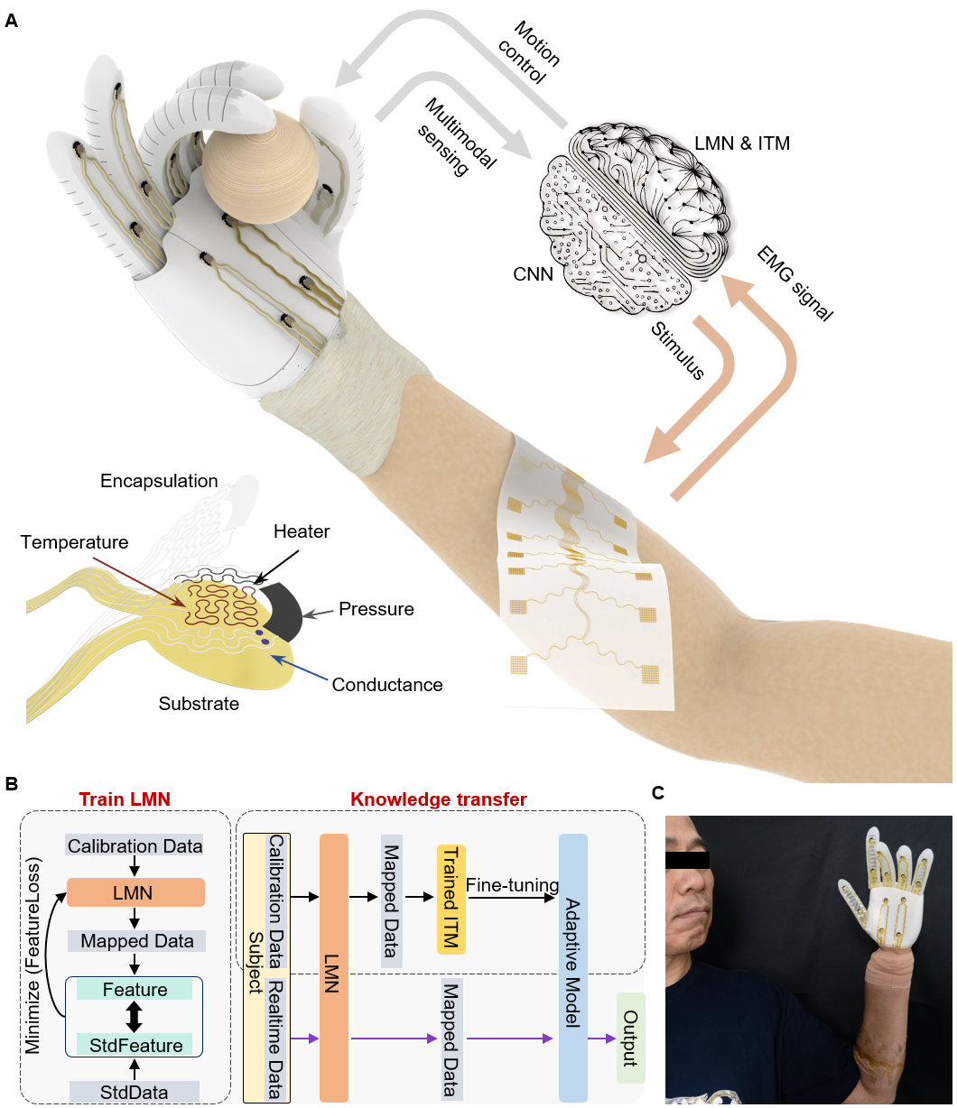 1,(A)双向信息采集和交互的柔性传感生物电子示意图;(B)自适应机器学习算法实现低样本量迁移学习并完成模型的个性化适配;(C)智能假肢在前臂截肢者的实际应用。