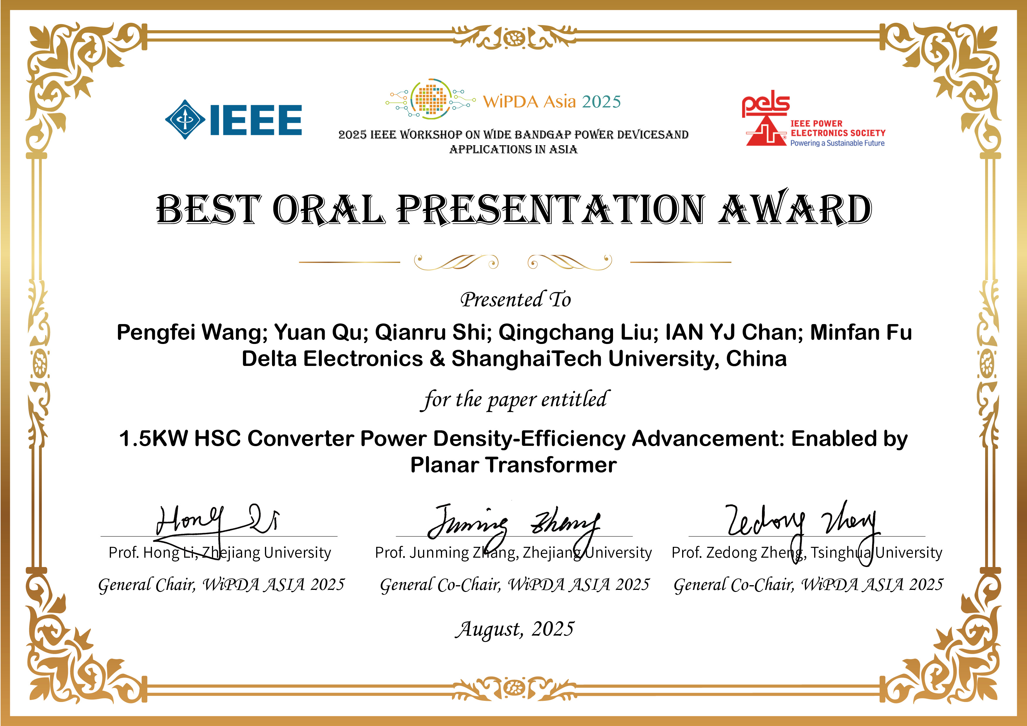 博士生王鹏飞是上科大首批在职专业型博士,现任台达电子资深电子设计经理,专注于服务器电源研发。他在论文“1.5KW HSC Converter Power Density-Efficiency Advancement: Enabled by Planar Transformer”中,面向数据中心与企业服务器对高效电源的迫切需求,提出基于电路拓扑优化和平面变压器设计的创新方案。该研究设计了一款1.5kW非隔离、非稳压降压型混合开关电容(HSC)转换器,仅通过两组1:1绕组实现4:1电压转换,大幅简化变压器结构及PCB布线,并利用对称电路有效均衡谐振电流、降低绕组损耗。在平面变压器设计中,采用异构UI型磁芯与三明治绕组结构,配合高频铁氧体材料,显著抑制漏磁、降低损耗。实验验证该转换器峰值效率达98.2%,满载效率97.4%,成功实现ZVS开关,波形与仿真高度吻合,为高功率密度电源系统发展提供了关键技术支持,具备重要的工业应用前景。