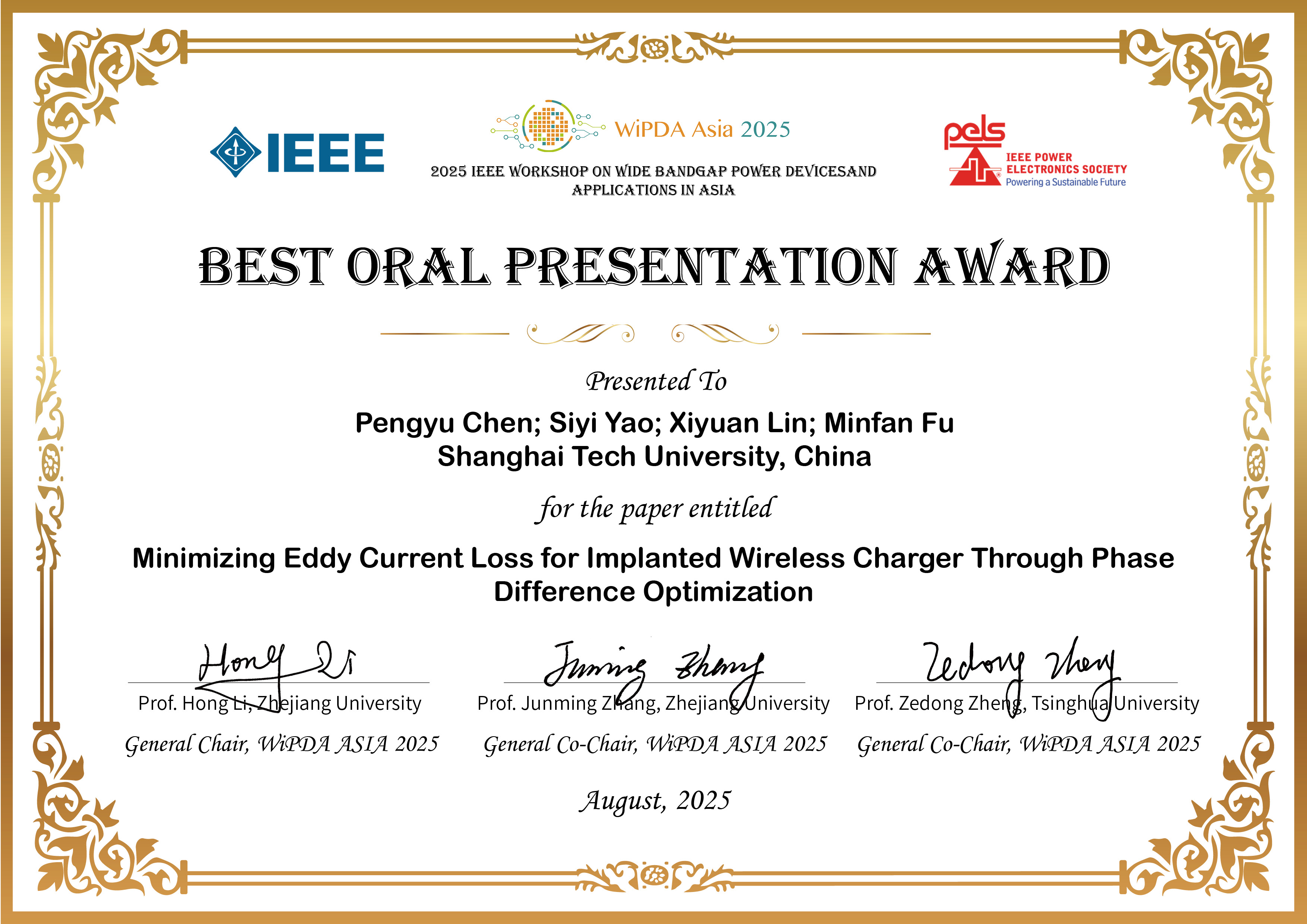 硕士生陈鹏宇为上科大与联影集团联合培养的专业型硕士,致力于植入式设备无线充电技术研究。他在论文“Minimizing Eddy Current Loss for Implanted Wireless Charger Through Phase Difference Optimization”中,针对植入医疗设备无线充电过程中金属外壳导致有害发热的行业难题,提出了基于相位差优化的控制方法。该研究跳出传统结构改造的局限,从电路层面建立涡流损耗模型,揭示了发射与接收线圈电流相位差与涡流损耗之间的定量关系。实验表明,将相位差由常规90°调整至最优角度,可降低涡流损耗70mW、温升下降0.4℃,在无需改动植入设备结构的前提下显著提升安全性,为高功率植入式充电系统提供了高效、临床适用的新路径。